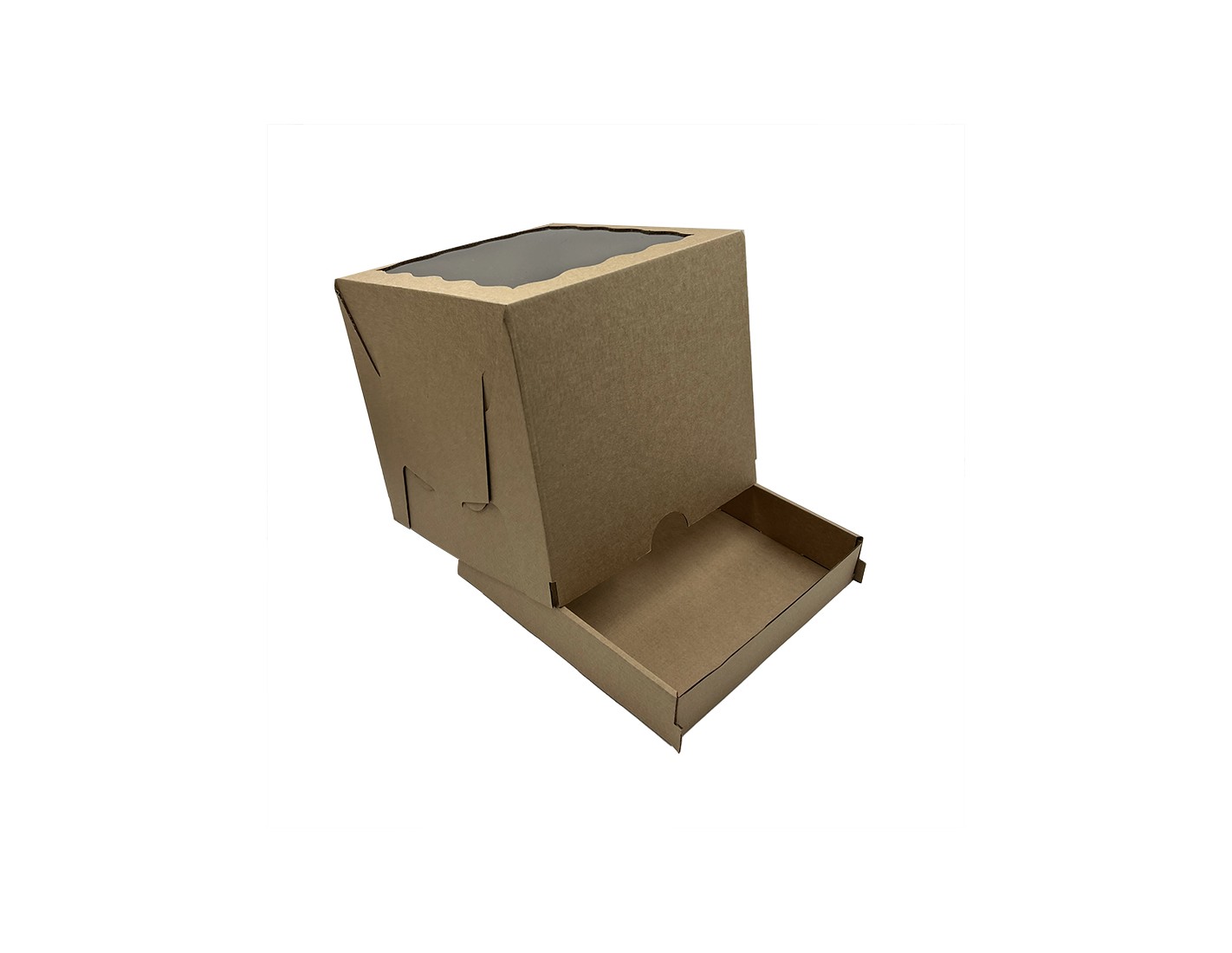 These are boxes for transportingcakes, pies, cobblers, doughnuts, cupcakes or single-crust sandwiches. Boxes are available in White/Brown or Brown/White paper. We offer your choice of imprint or logo on the boxes. The boxes can also be fitted with a PVC window to show the beautiful cake.