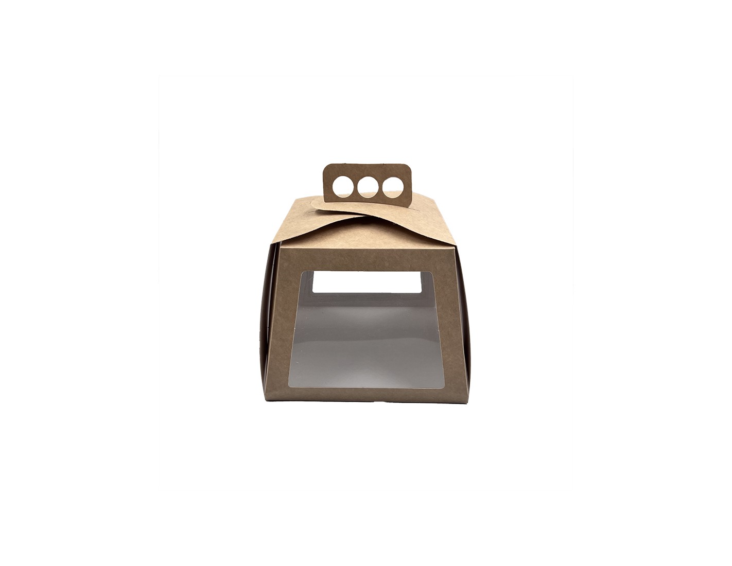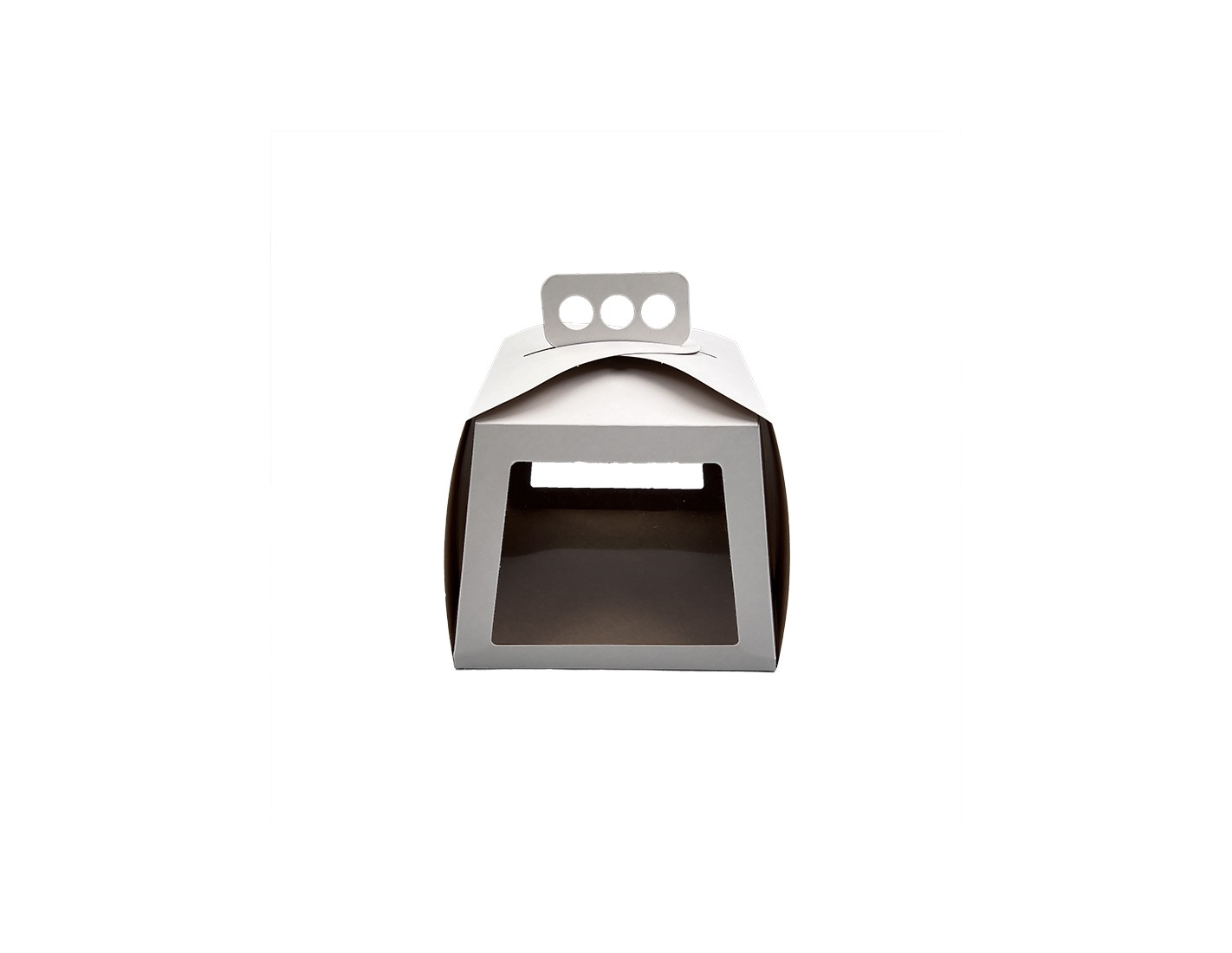 Exclusively designed white or brown cardboard box for cakes or tarts with a plastic window on two of the four sides of the box. The windows allow an open view of the contents of the box, giving an aesthetic appearance and allowing easy viewing of the product inside. The box is easy to assemble and has a convenient handle adapted to carry the product safely and comfortably.