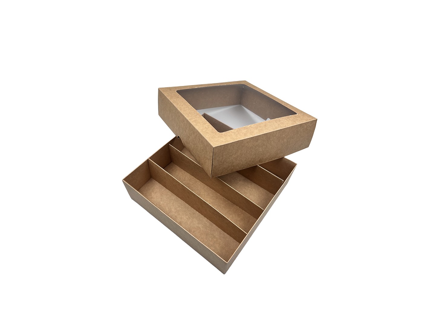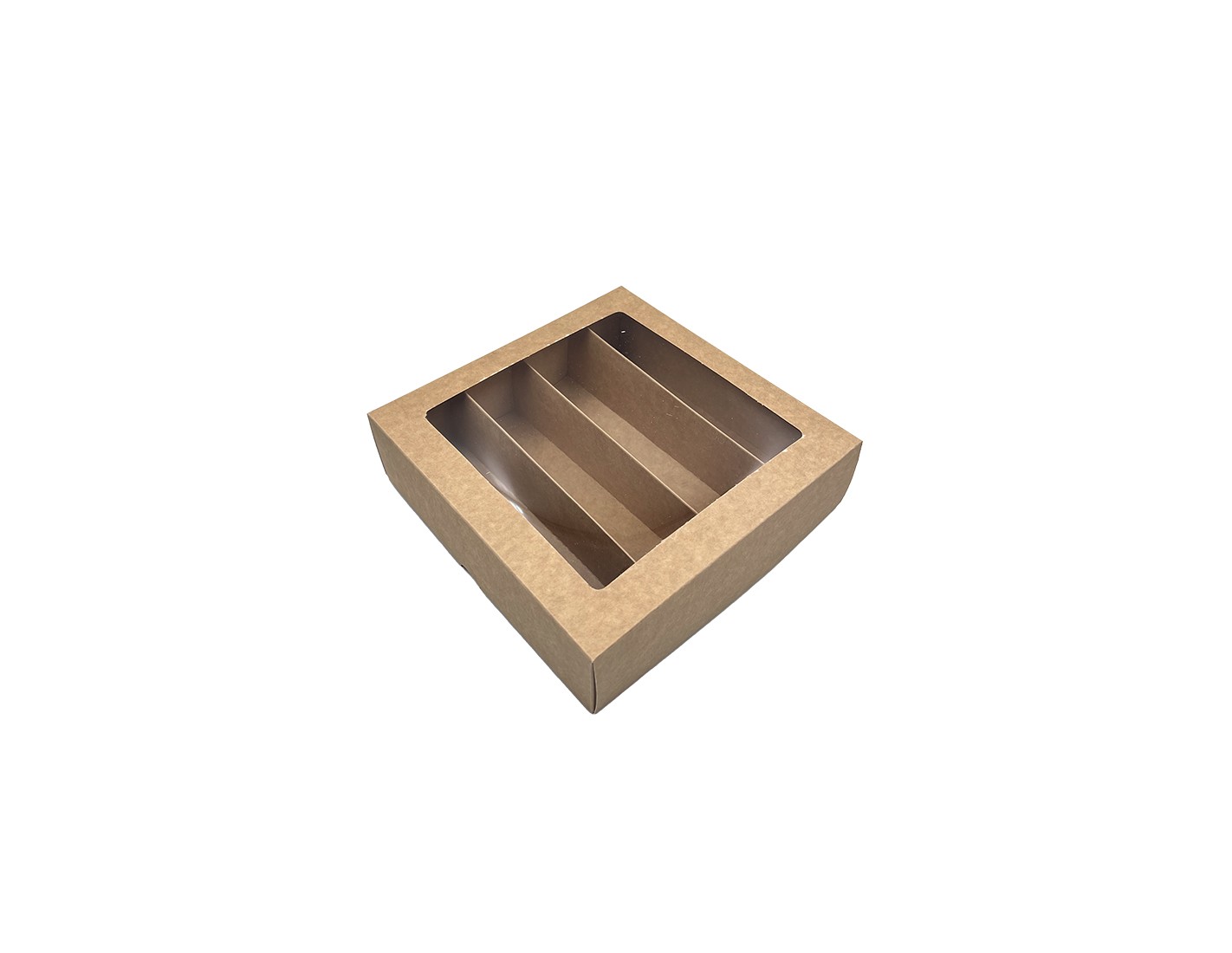 4 compartments/rows of macarons in a two-part box. The box is sturdy and the paper keeps the desserts safely separated. PVC window allows you to see the contents of the box.
