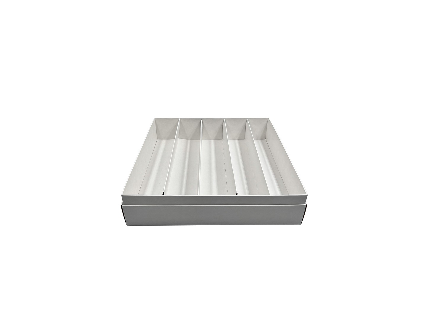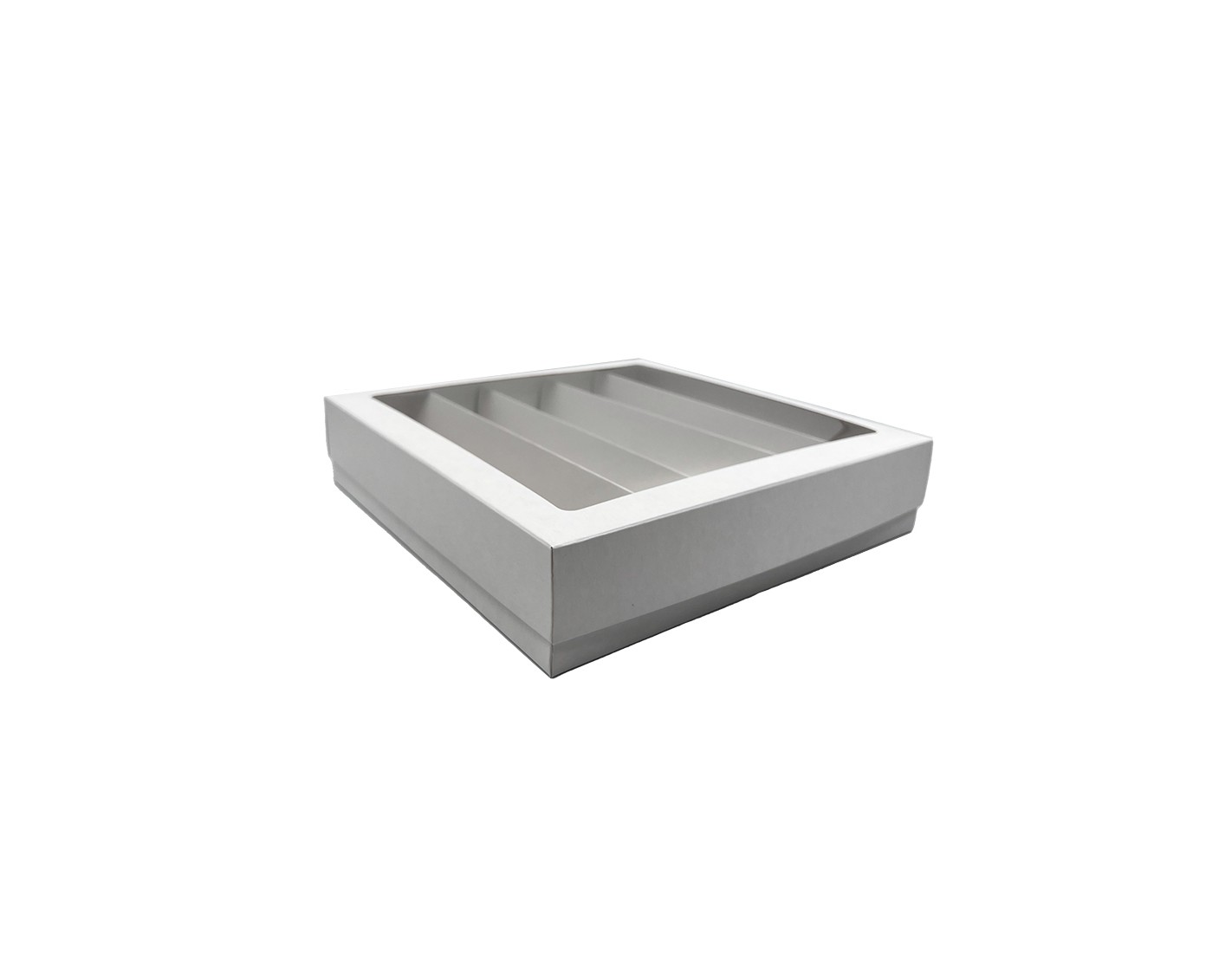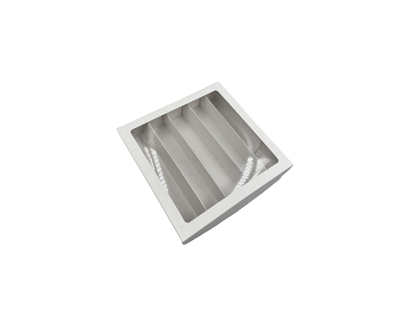 5 compartments/rows of macarons in a two-part box. The box is sturdy and the paper keeps the desserts safely separated. PVC window allows you to see the contents of the box.