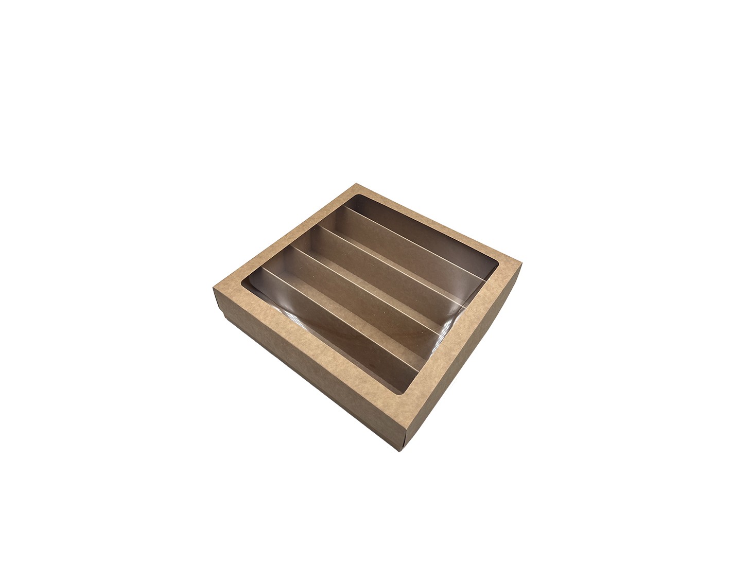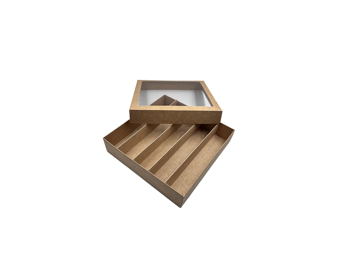5 compartments/rows of macarons in a two-part box. The box is sturdy and the paper keeps the desserts safely separated. PVC window allows you to see the contents of the box.
